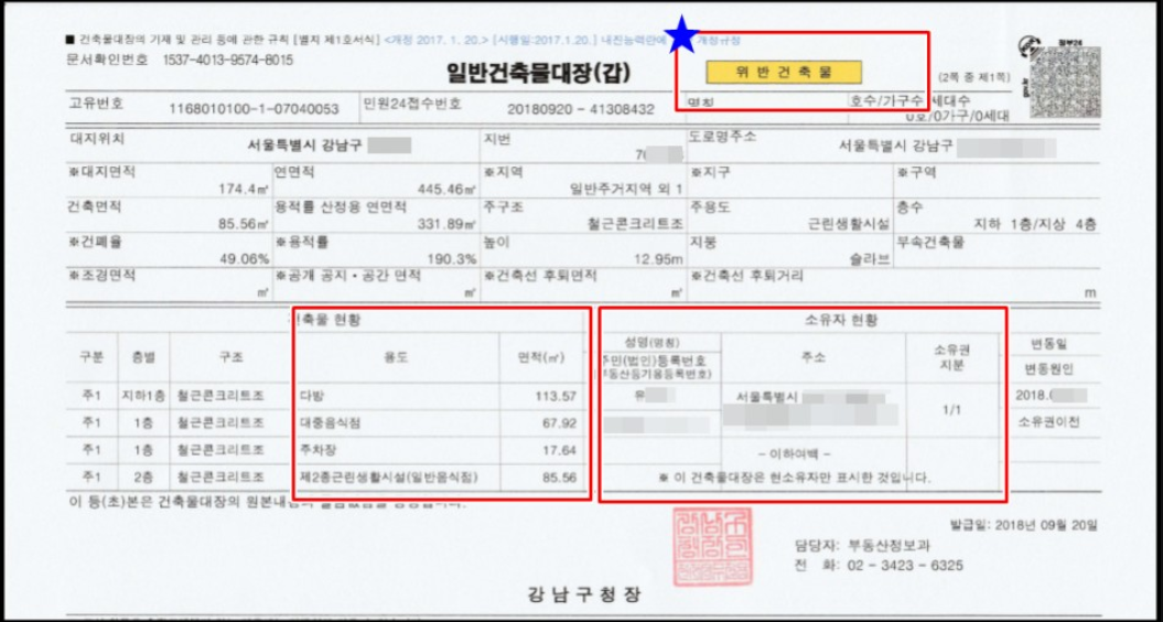 건축물대장 문서에서 불법건축물 표시가 되어있을 경우에는 방쪼개기, 불법증축 등 어떤 부분이 불법인지 확인해요.